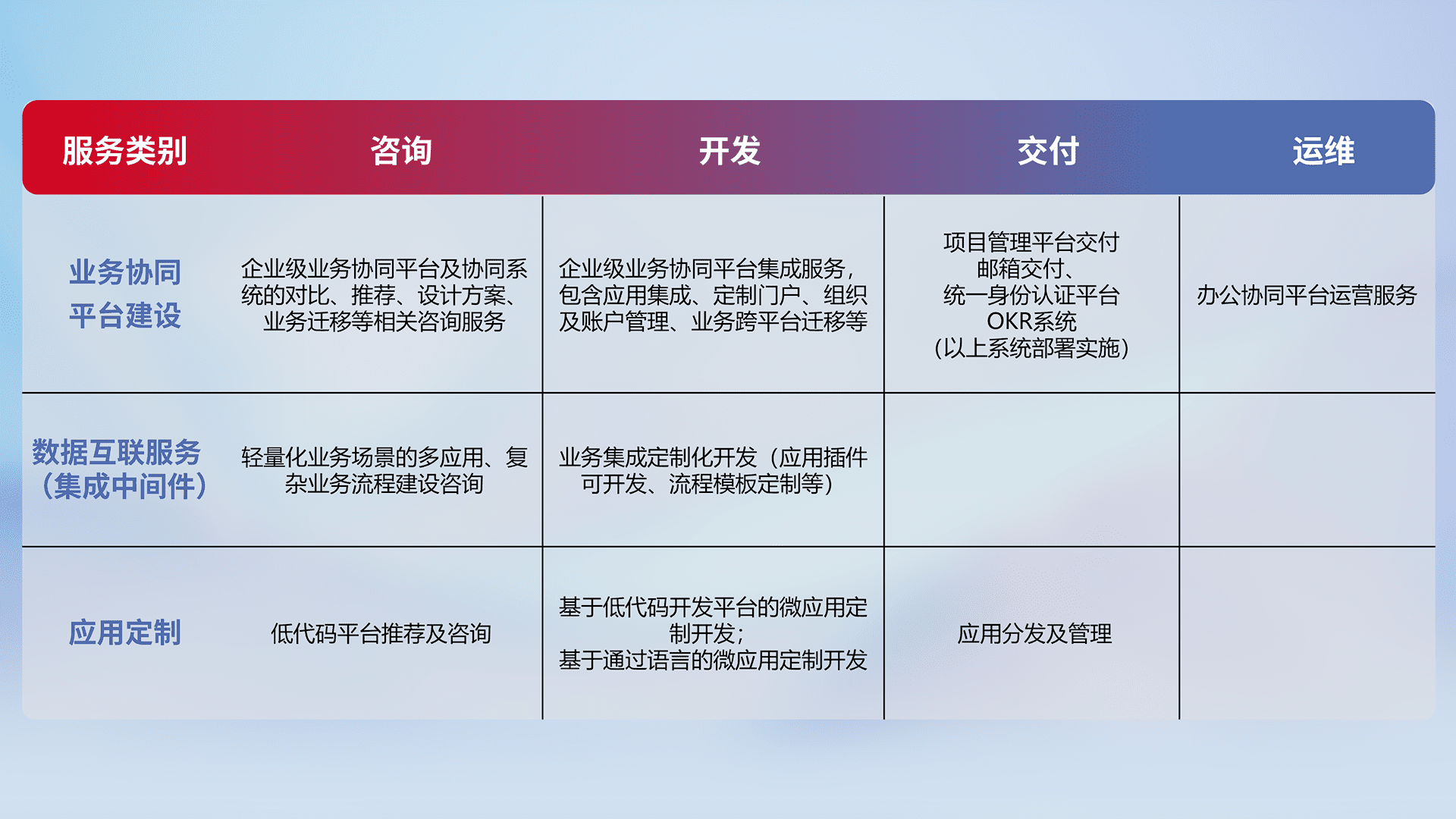 针对钉钉、、企微、、、、IDaas等平台级产品提供产品的规划、、、方案、、、交付、、定制化开发等服务,,,实现如统一协同办公、、、智能客户服务、、、混合会议管理、、、、智能数据查询、、、、等业务场景,,,实现数字化转型。。。。
